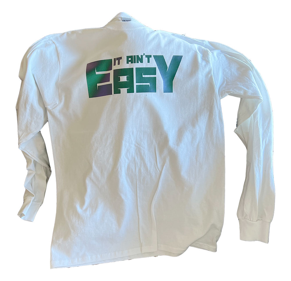 Men’s adult long sleeve white t-shirt with metallic gradient “It Ain’t Easy” text logo design. Available in men’s sizes XS – XL.